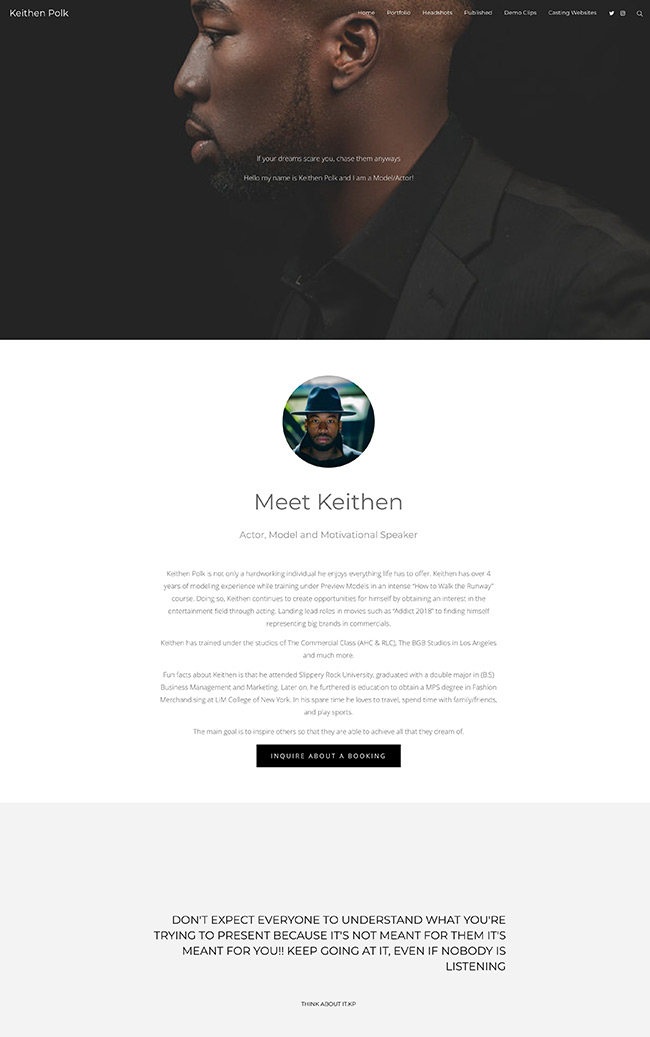 Keithen Polk est un orateur motivé, un mannequin et un acteur. Le minimalisme percutant est l'une des caractéristiques du site Web du portfolio de mannequins de Keithen. Il utilise une palette de couleurs sombres et une image de couverture saisissante pour attirer l'attention sur le centre du site. En faisant défiler la page vers le bas, on peut lire une brève présentation de Keithen et de son travail, ainsi qu'un lien vers ses informations de réservation.